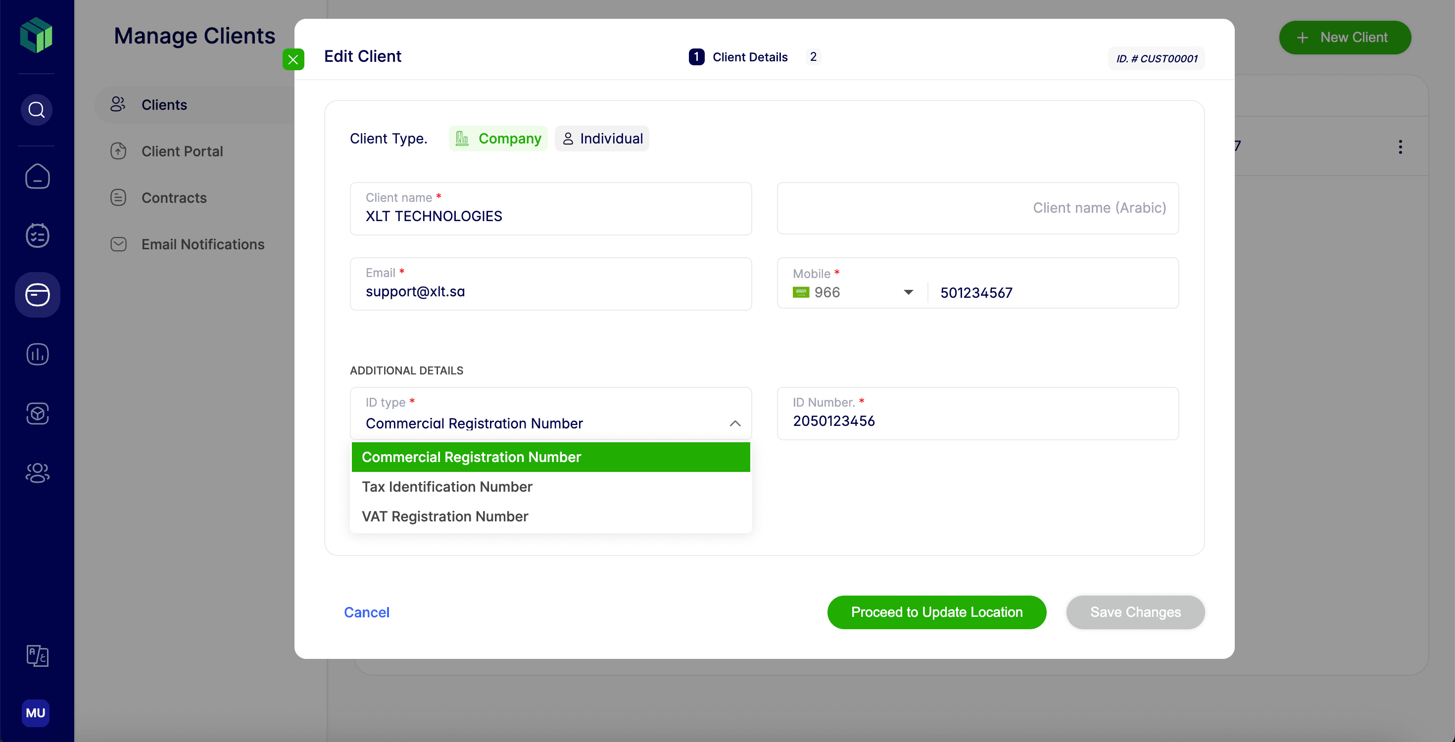 Select the appropriate ID type from the drop-down menu (e.g., Commercial Registration Number). Then enter the corresponding: